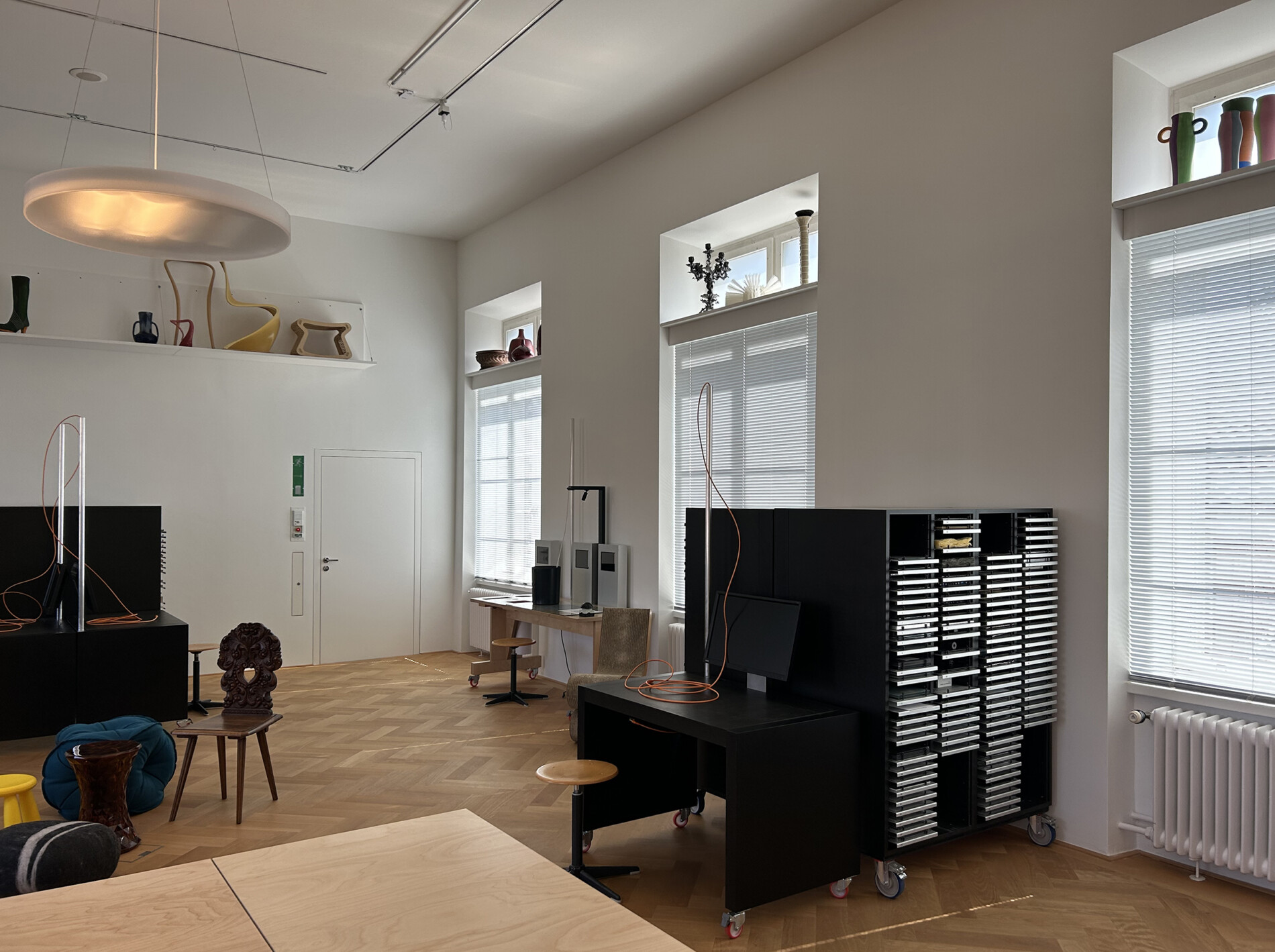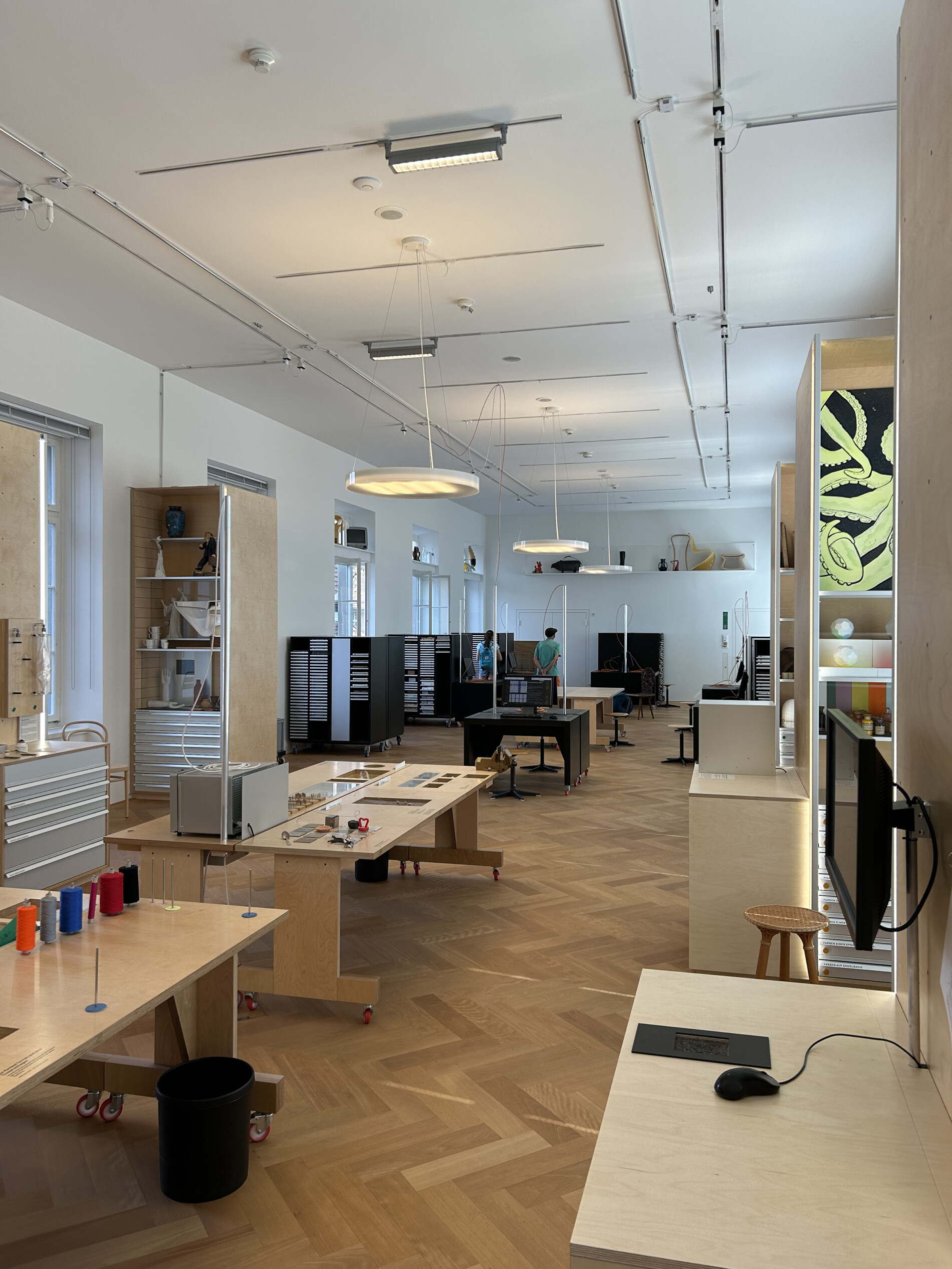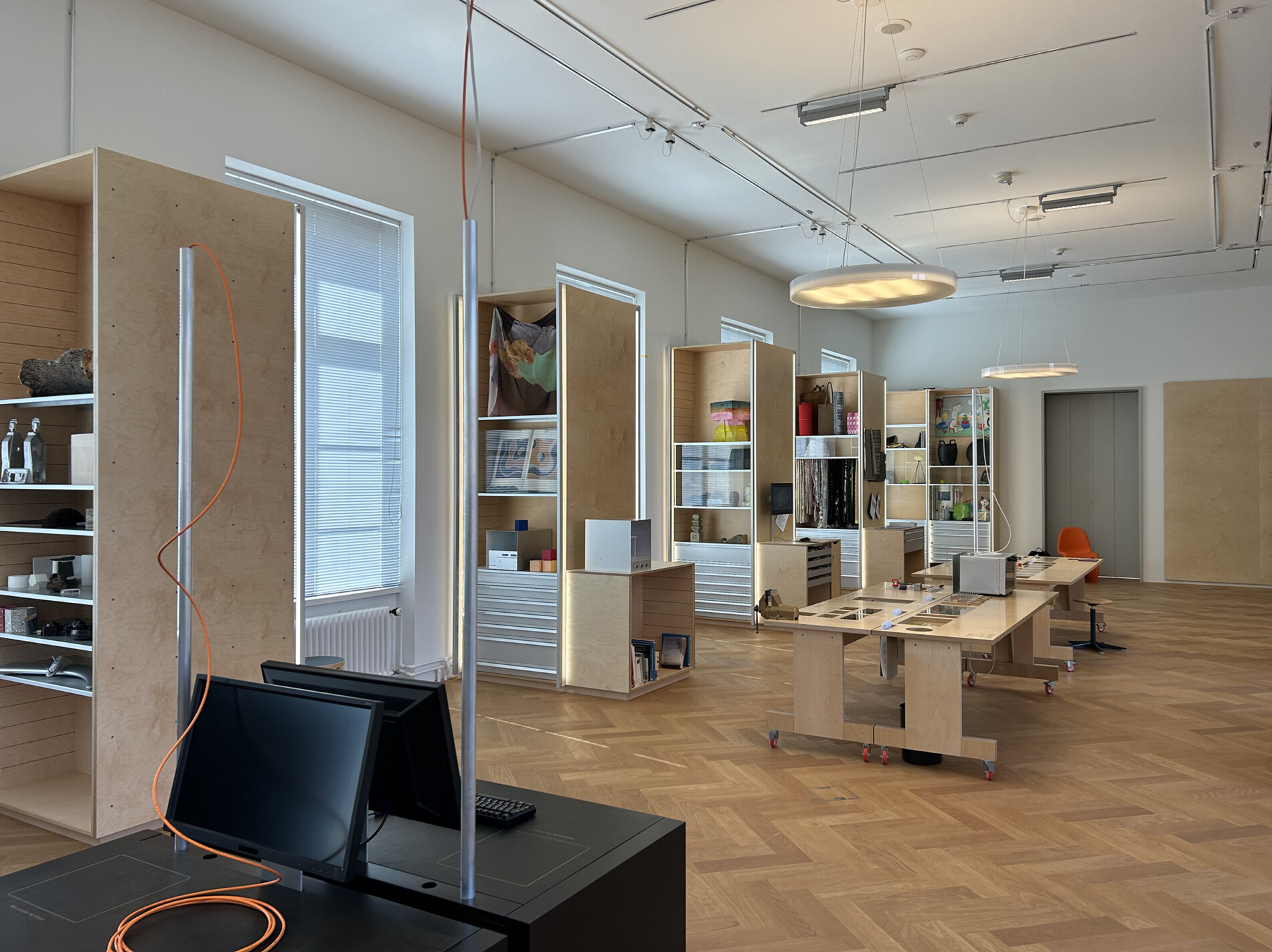 studie und konzeption einer modularen und flexiblen raumgestaltung. entwicklung möglicher varianten bezüglich umzug oder verbleib des material archivs im bestehendem raum. planung neuer arbeitsstationen für unterschiedliche vermittlungssituationen inkl. beleuchtungsplanung und signaletik.
